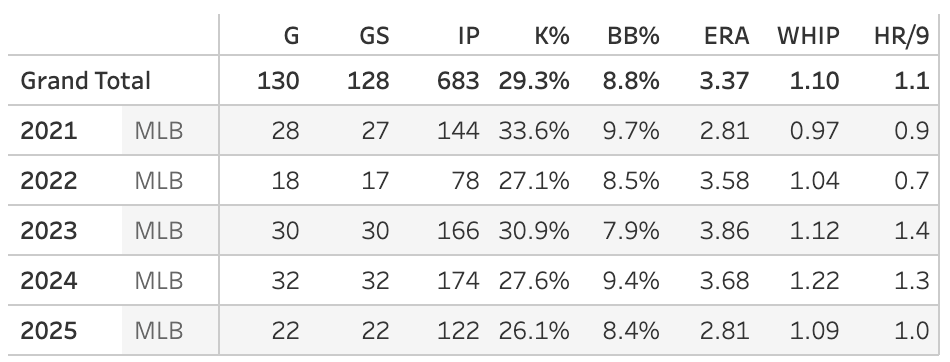 He’s still not getting many ground balls, but it’s not completely disastrous this year at a 39% GB%. He’ll give up some dingers, but he looks like a guy who will reliably deliver strong K-BB stuff, and that’s the most important thing.