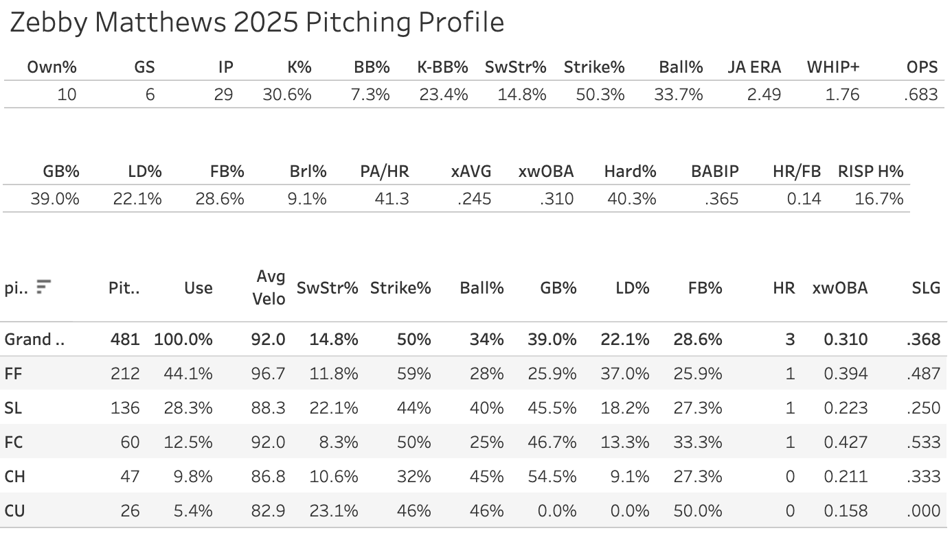 I think Zebby Matthews is going to finish the year extremely well. He now sits with a 2.49 JA ERA on a 23.4% K-BB%, a 14.8% SwStr%, and a 33.7% Ball%.