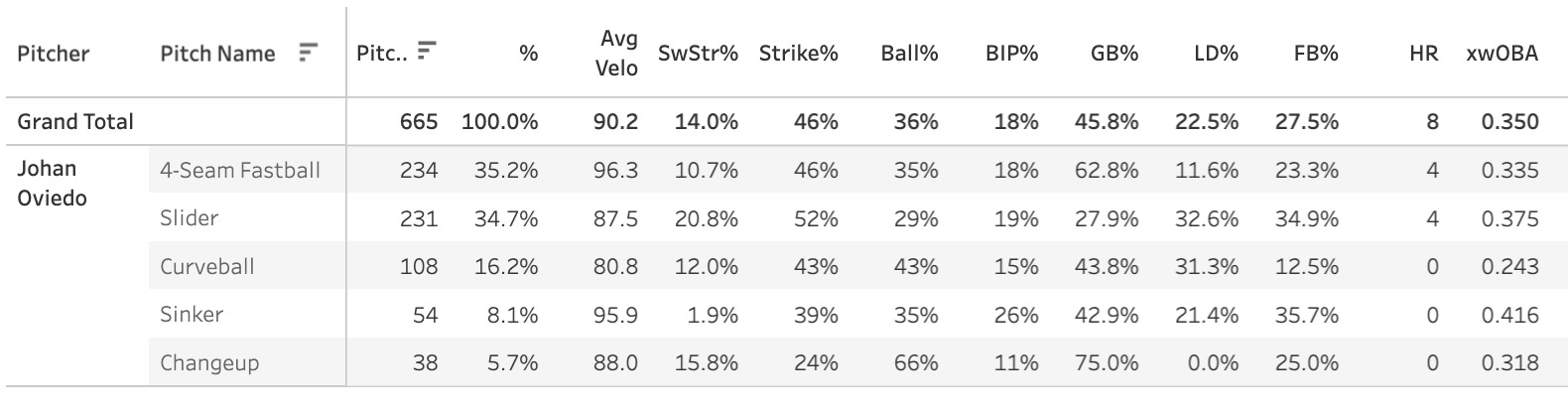 Johan Oviedo's SI velo (12 pitches) DOWN -1.7mph to 94.7