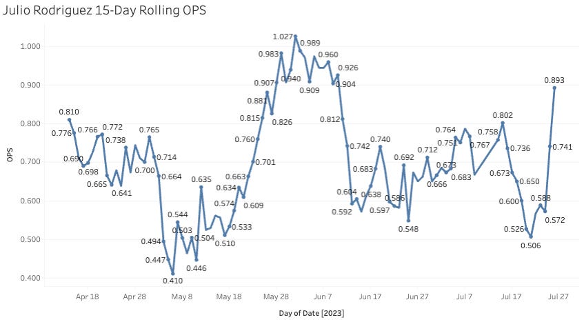 So he’s been pretty steady for the most part this year, although you do see that the walk rate has been back down under 5% since June. That didn’t help him much in June with the still bad ERA, but in July things have come through a lot better. I still don’t think he’s in the ace tier, but he should have more good starts than bad - and yesterday was a good one.