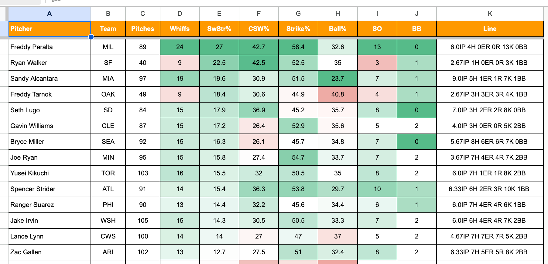 1. Freddy Peralta (MIL): 24 Whiffs (89 Pitches)