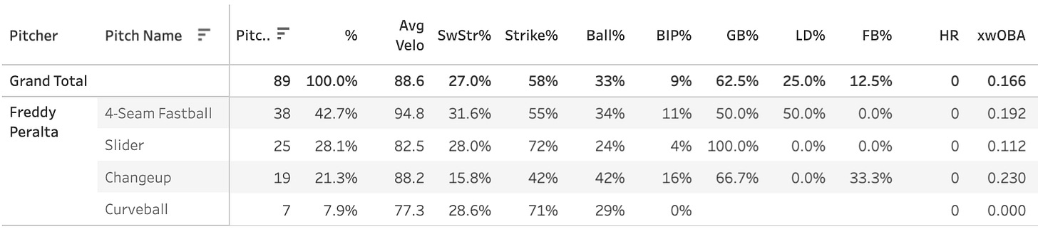 He ripped strikes off at a crazy high rate at 58.4%, and the 9% BIP% was just absurd. A BIP% under 10% has happened only 66 times this year, so it was just a magnificent start from Peralta.