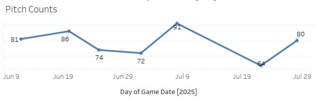 The Jacob Misiorowski hook! He threw 80 pitches and was yanked. Last time, he threw 64 pitches and was yanked. His pitch counts this year: