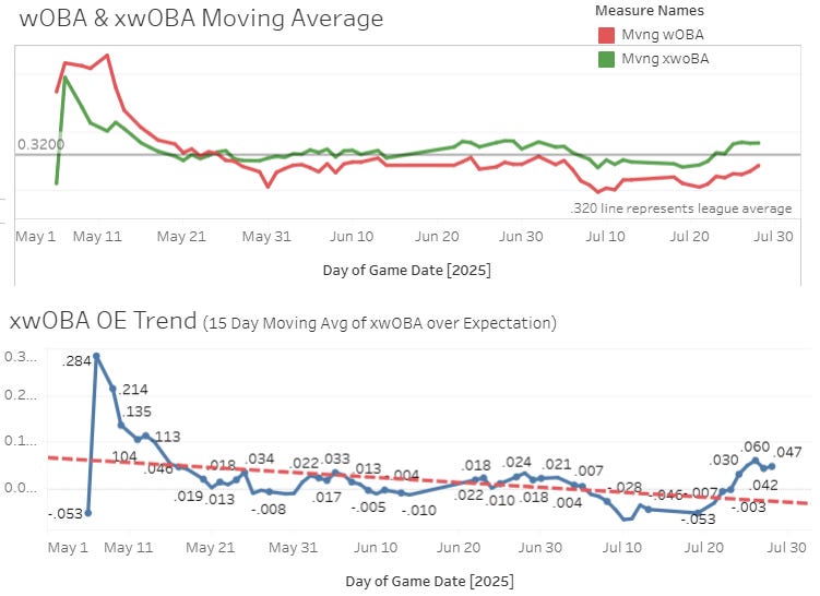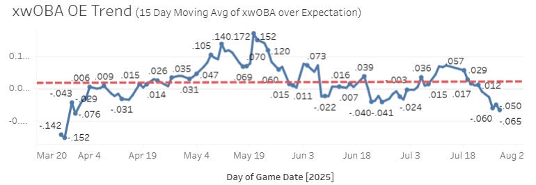 I really like this xwOBA OE stat. It’s not that much different than xwOBA, but it’s a little bit better since it adjusts for pitch quality, and also I came up with it so that makes me think it’s better and cooler and awe-inspiring.