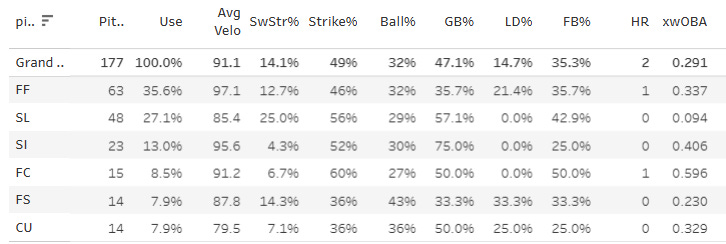 He’s at 58% fastball and 34% slider usage. He throws 61% fastballs to elfties and does not have a third pitch agaisnt righties. So you know what’s coming. With three balls, he throws the fastball 81% of the time. And big leaguers can hit whatever you throw if they know you’re about to throw it. So you’ll continue to see Burns give up some hard hit balls, but the K-BB% looks like it’s going to be fantastic, which means that he’ll be very much a net positive in the fantasy game.