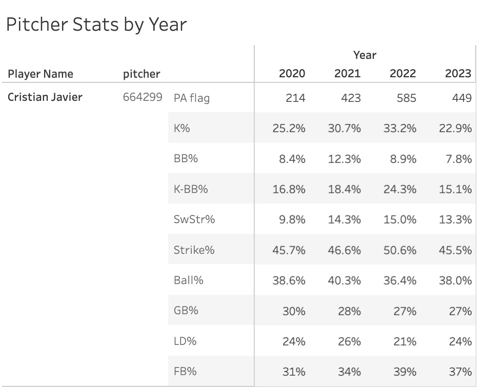 5. Cristian Javier (HOU): 52.9 Strike%, 36.5 Ball%