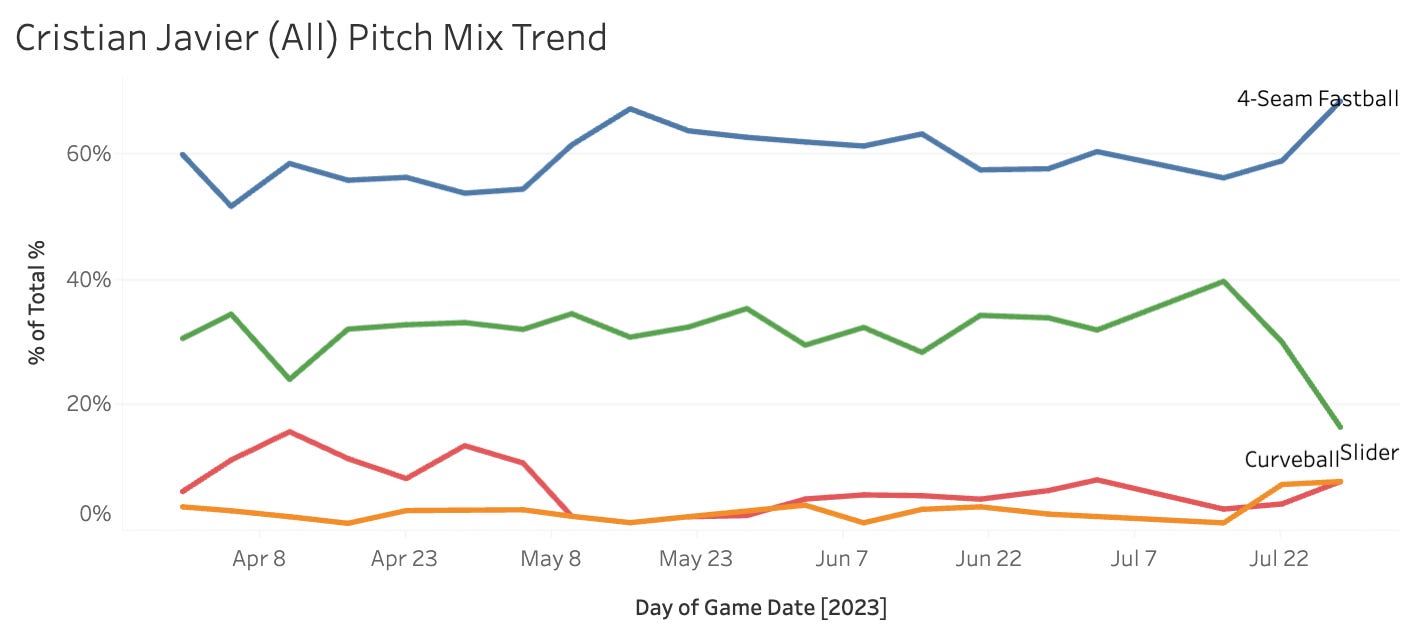 Cristian Javier got the whiff going again yesterday with 22 of them. He recorded nine strikeouts despite giving up three earned. That was his highest whiff count since May 10th. But still, for the year the SwStr% is at just 13.3% -a far cry from what we saw last year. He actually used the four-seamer at a season-high 68% clip, which makes the spiked whiff thing a bit strange.