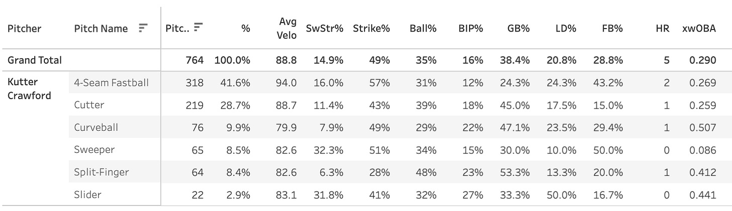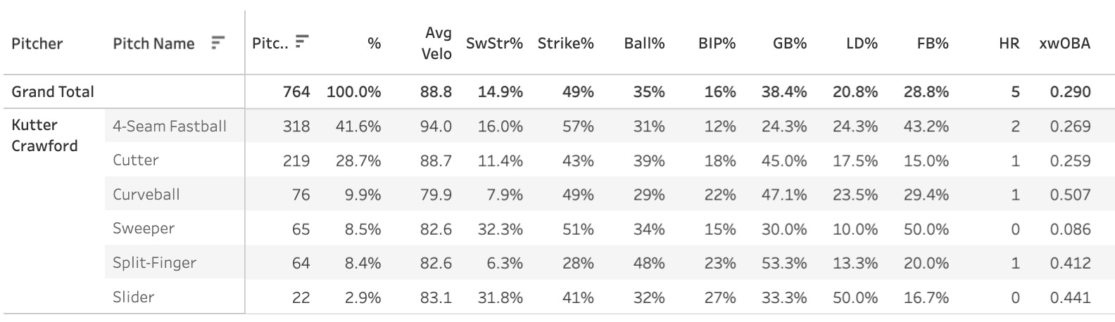 7. Kutter Crawford (BOS): 51.2 Strike%, 33.7 Ball%