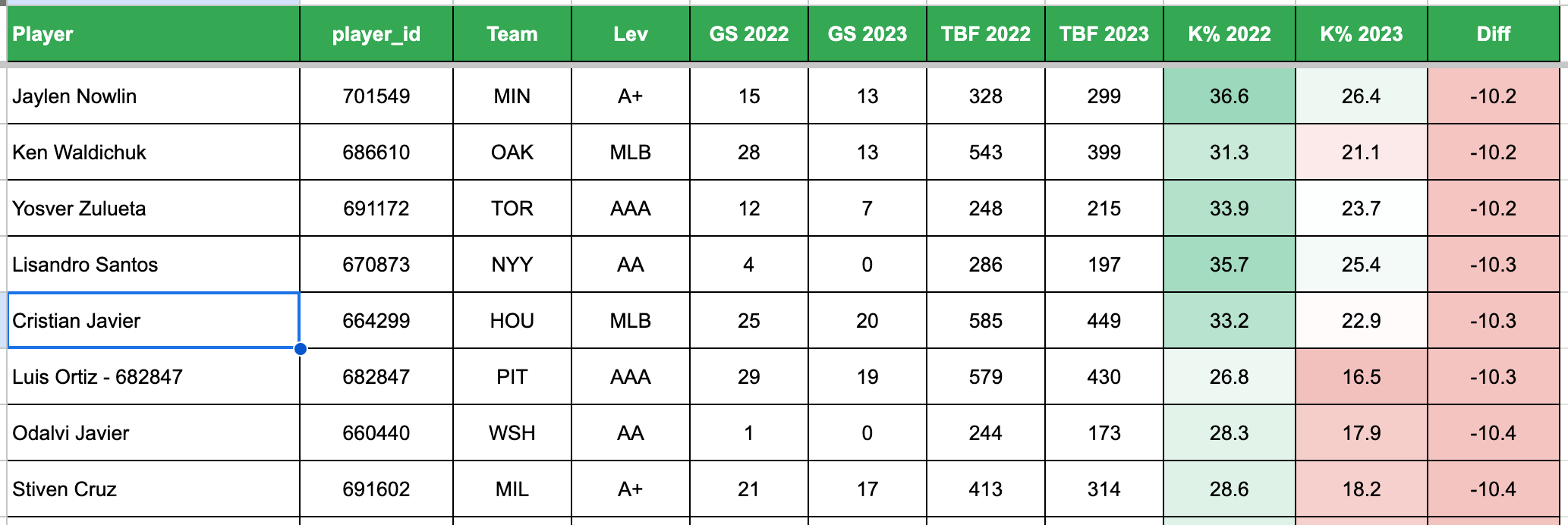 Speaking of drops in K%, I designed a new google sheet yesterday! It tracks 2022 vs. 2023 K% for both hitters and pitchers and shows the differences for each player. And it is applied to all levels. Check that out here. Here’s where we find Javier on there: