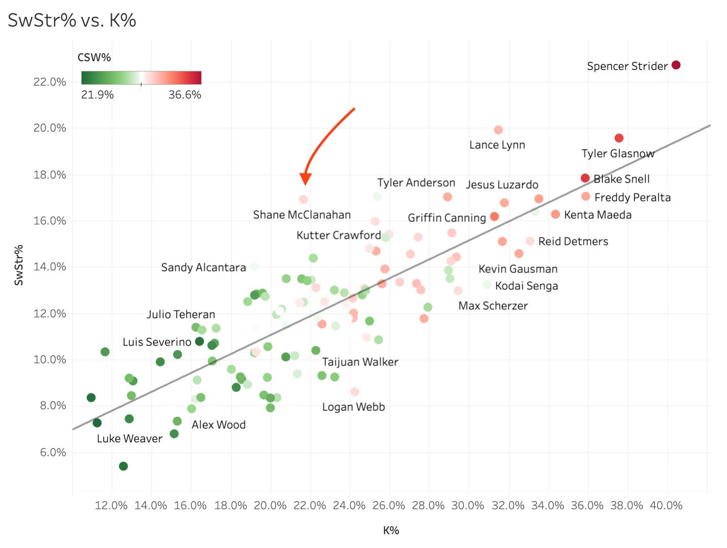 14. Shane McClanahan (TB): 46.5 Strike%, 33.7 Ball%