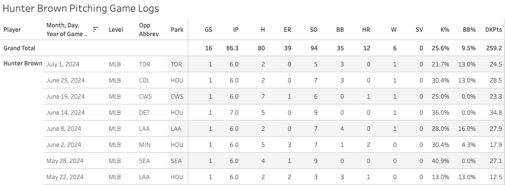 Brown leads the league in ERA since May 22nd at 0.50. Zero point five. The WHIP is great at 0.83 there as well, and a 25% K-BB% is encouraging to see. The strength of schedule has been laughable here, it’s hard to believe you could get this many great matchups in a row, but you have to give Brown a ton of credit for dominating this stretch in this fashion. If all goes to schedule, he will face the Twins on the road and then the Rangers at home to wrap up his first half. Tougher matchups. He will either get the Mariners or Athletics coming out of the break and if he is one of their first starters out of the block, that will be followed by a tough match against the Dodgers.