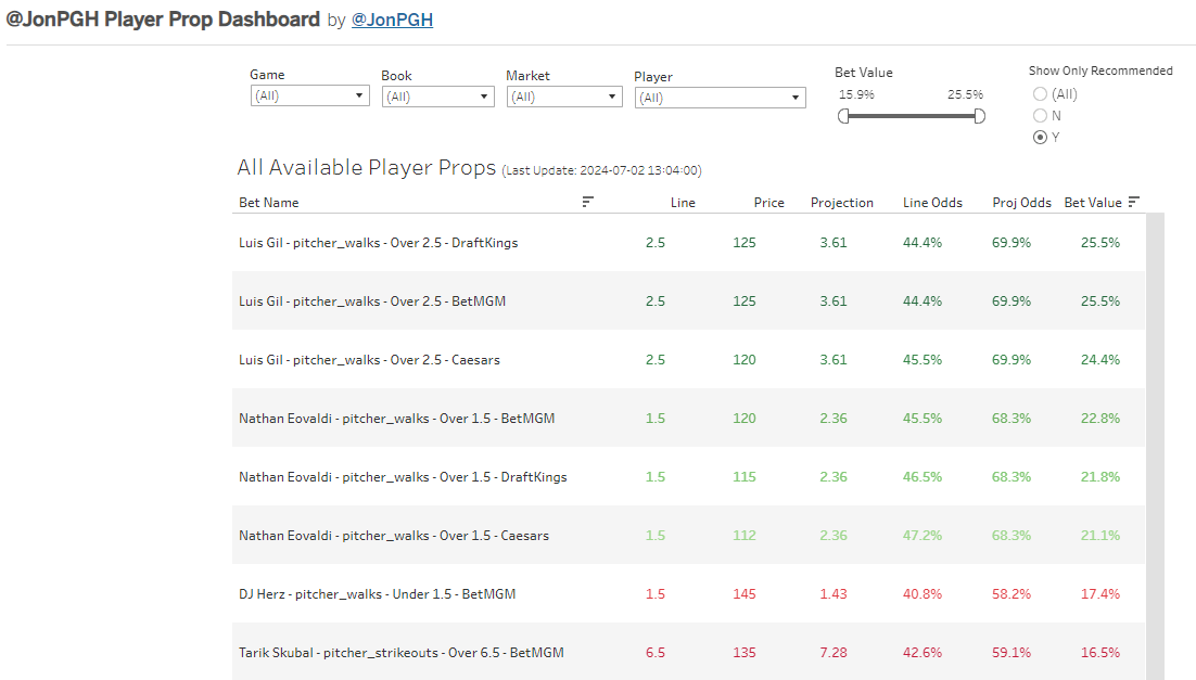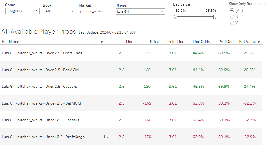 The model has Luis Gil with a base walk rate around 11%, and that projects out to a really high 3.6 walks tonight. So the over 2.5 walks looks good, and now you can use this tool to see which sportsbook has the best price on it:
