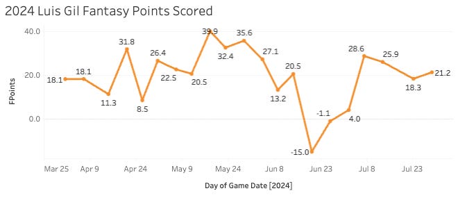 My old college roommate is in my fantasy league. He’s having a nice season, was around 3rd place for most of the year. But he just took a spanking last week and now he’s tied for 4th (with me!), right on the playoff bubble. So he’s down in the dumps and in a real doomsday mood in our slack channel. So he predicted that his two aces Logan Gilbert and Zack Wheeler would both get smacked around, and he was right!