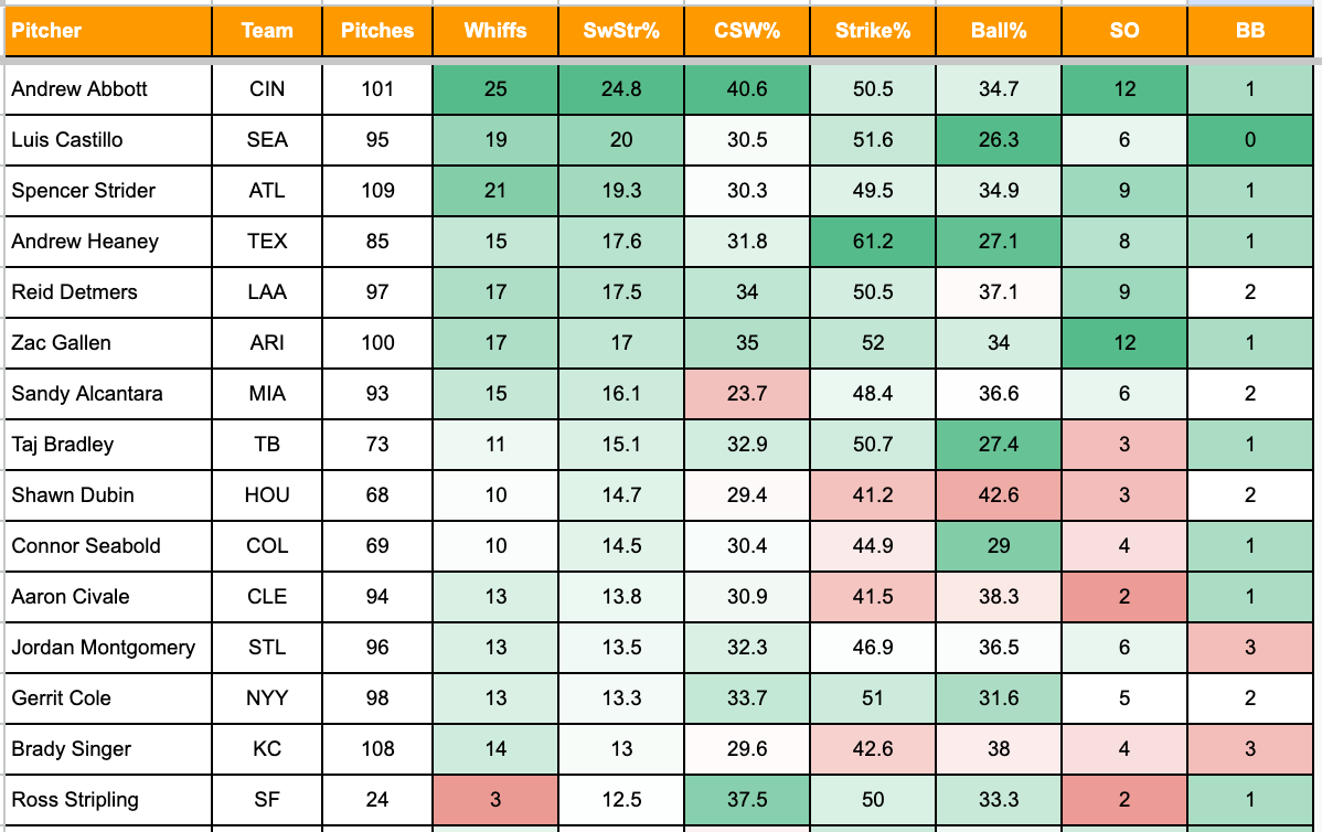 1. Andrew Abbott (CIN): 25 Whiffs (101 Pitches)