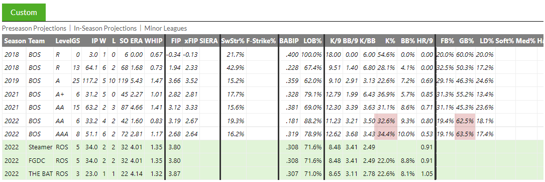 Brayan Bello will debut on the mound for Boston tonight, and my oh my is this guy interesting. This season in the minors he has gone for a K% above 33% and a GB% above 63%.