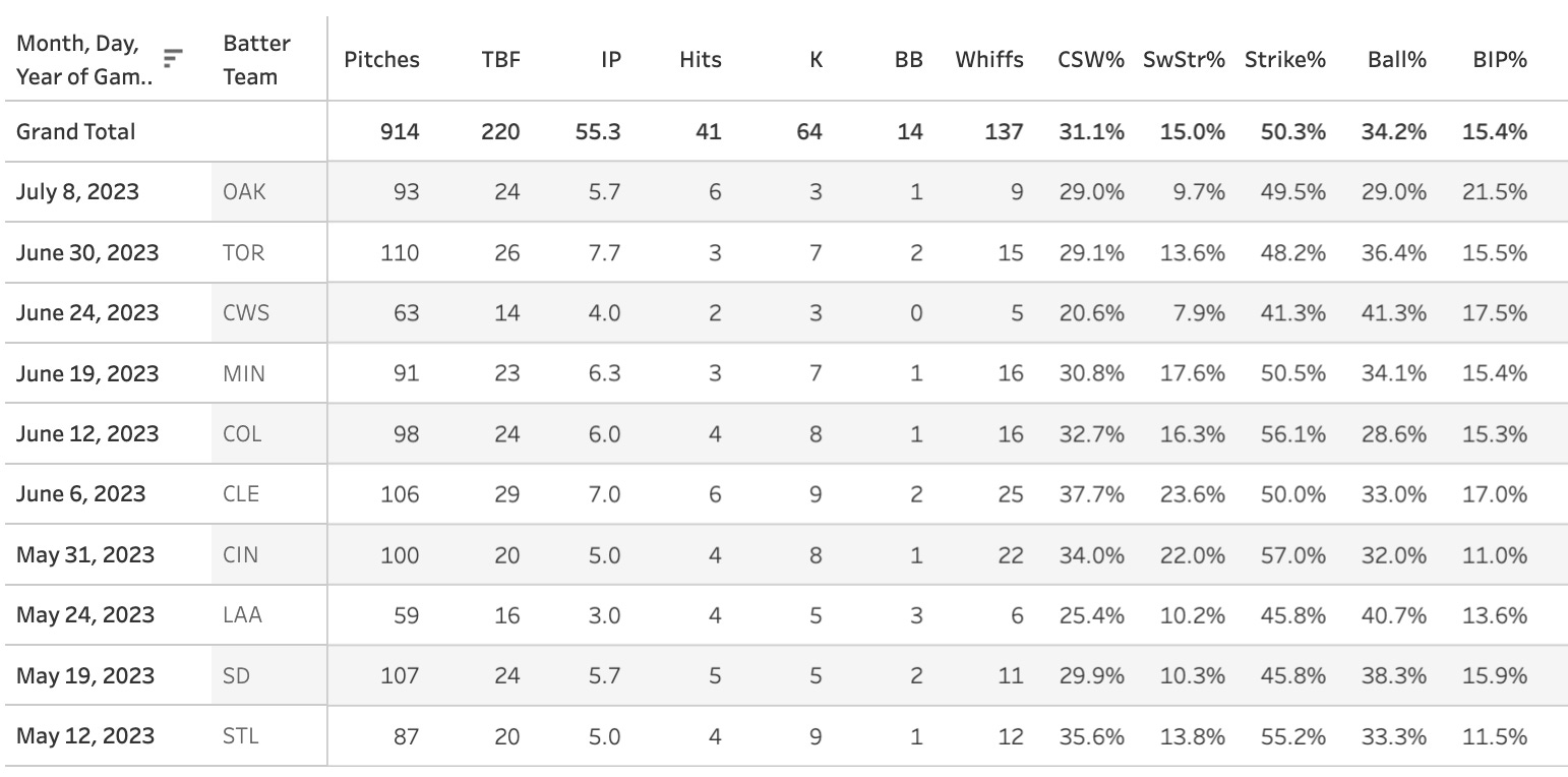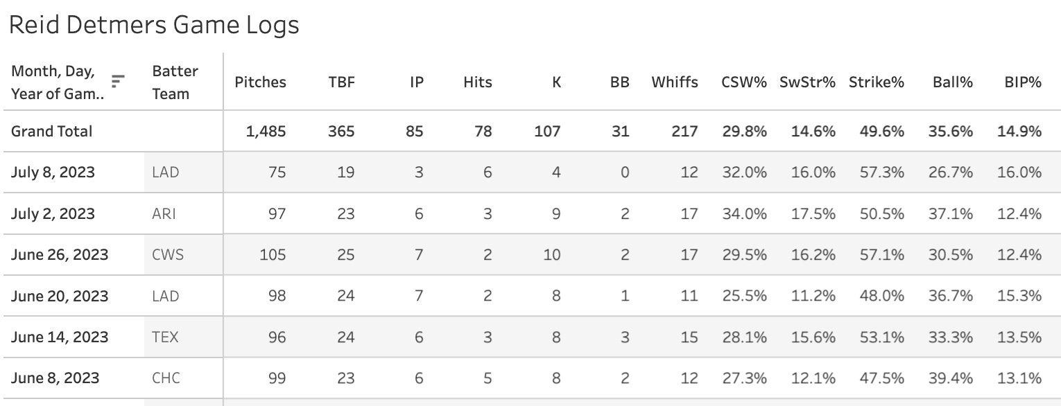 Reid Detmers gave up three homers but still had a nice 16% SwStr% and 57.3% Strike% game. For the year, he’s up to a 14.6% SwStr% and 35.6% Ball%, pretty good stuff. Maybe he’s finally figured out some sort of consistency, he does have a pristine 29.3% K% and a fine 8.5% BB% on the year.