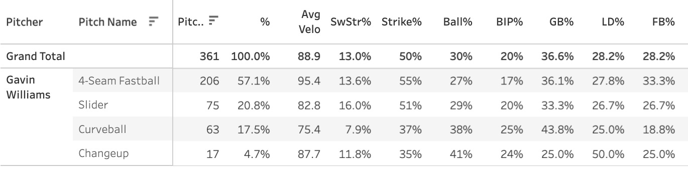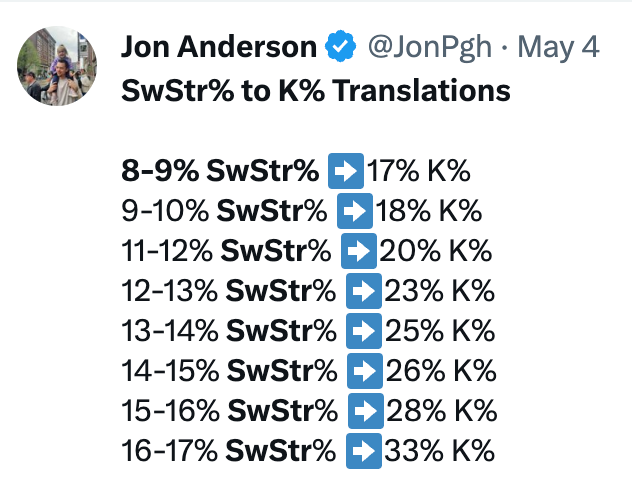 The 30% Ball% is really good. That puts him fourth in the league behind just George Kirby, Joe Ryan, and Jeffrey Springs - so a very good sign if that keeps up.