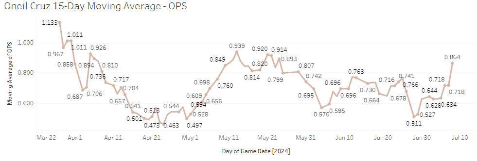 Oneil Cruz also had a big games with a homer, two runs, two RBI, and two hits. He’s hitting a decent .247, but the OBP is bad at .303 and the slugging is shy of what you’re wanting at .444. He is striking out at a 32% clip and not walking all that much (7%). It’s been a season of streaks for Oneil, and I think that’s just how it’s going to be for the big man.