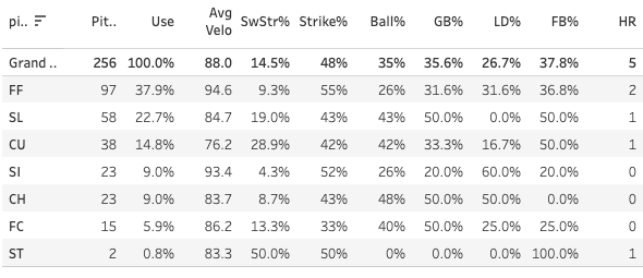 I’m always willing to forgive a bad start that comes on multiple homers given up. Homers are pretty random. Even if the best starters will have some poor outings because they give up a few longballs. But Cecconi is walking on thin ice already. He hasn’t exactly earned the right to forgiveness. And the 3:3 K:BB is bad. The SwStr% was just 8.4%. The pitch mix update on his 256 pitches: