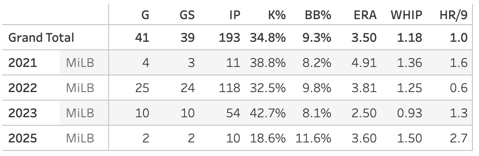 Looking a little bit like Tobias Myers last year with the nice ERA but pretty poor K% and K-BB%. But he’s held it together, giving up no more than three earned runs in any start this year.