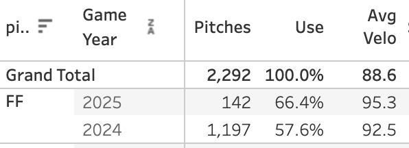 Huge marks on the four-seamer (19% SwStr%, 55% Strike%, 29% Ball%). In his case, the velo is way up on the pitch:
