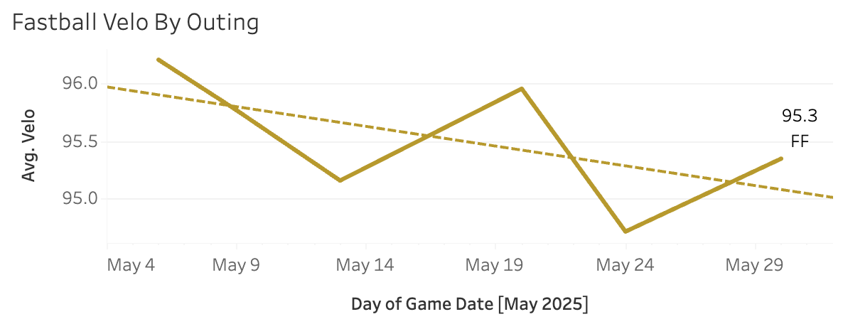 That’s very intriguing. The slurve is also up almost 3mph and it’s been great on its 54 offerings. However, remember that Harrison started his season with four relief appearances. We have to beware of the increase velo, then. But he averaged 95.3 on that Saturday start, so there’s reason to believe the velo might be here to stay.