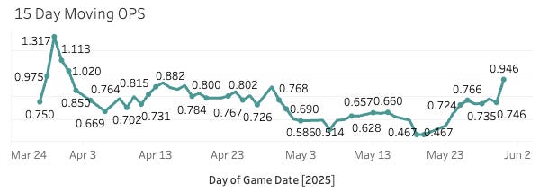 He’s now hitting .265/.291/.512 for the season with 13 dingers on a 19.3% K%. The question with him has been about launch angle. He’s hit many balls on the ground in his young career so far. And what we saw just a few days back was that when he was launching the ball - he wasn’t hitting it nearly as hard.
