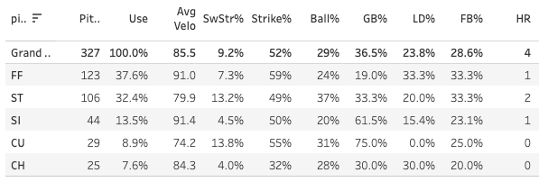 5 IP, 5 H, 4 ER, 6 K, 1 BB, 16% SwStr%, 52% Strike%, 29.3% Ball%