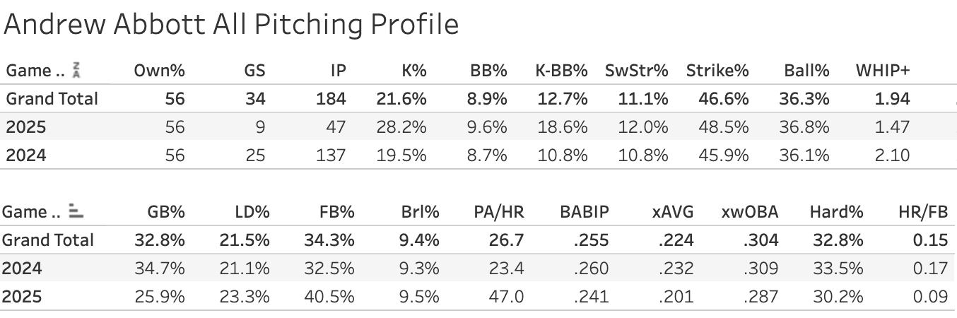 The four-seamer has gone from a 9% SwStr% to 11%. Good news there. And maybe he has discovered some extra deception and command this year. It seemed like the left-handed delivery was part of the crazy minor league strikeout totals for both of these guys - because they’ve never had big stime “stuff”. Bottomline is that you’re starting Abbott for the near future, I just think that K% is going to bubble down 25% or so.
