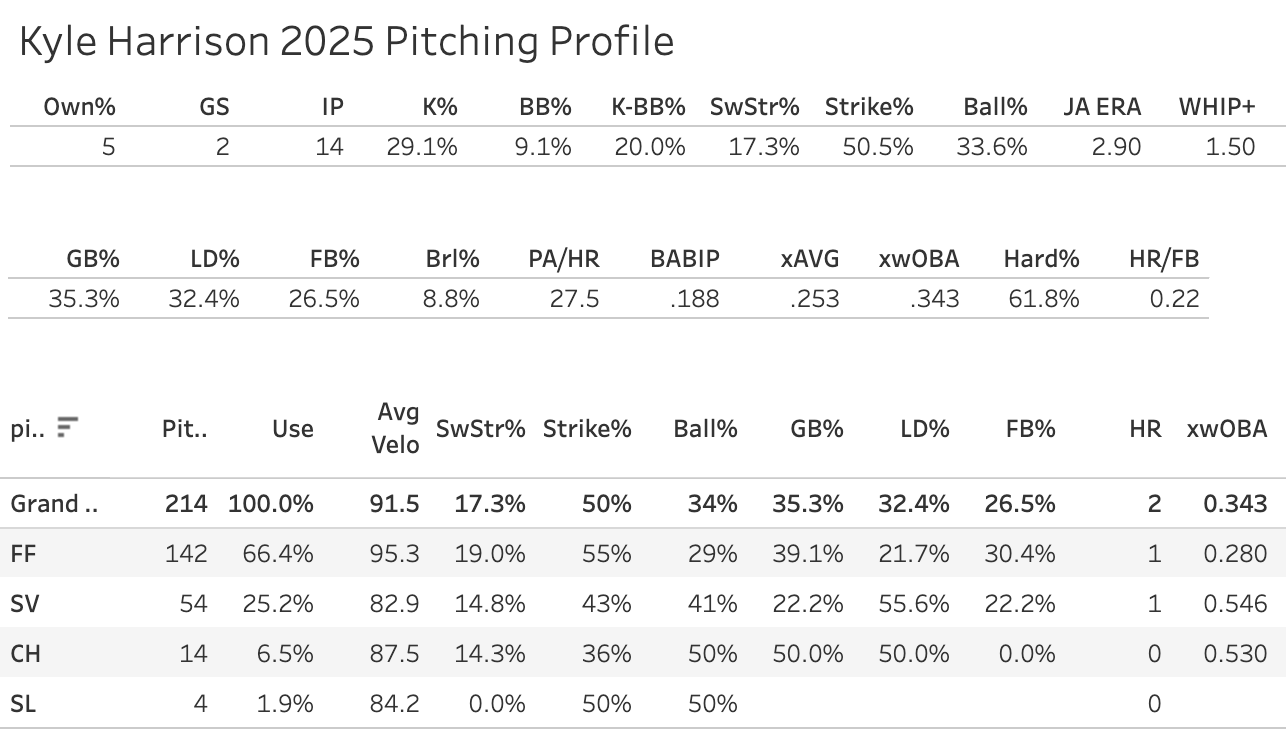 Harrison: 4.47 ERA, 1.30 WHIP, 22.5% K%, 7.8% BB%, 1.5 HR/9