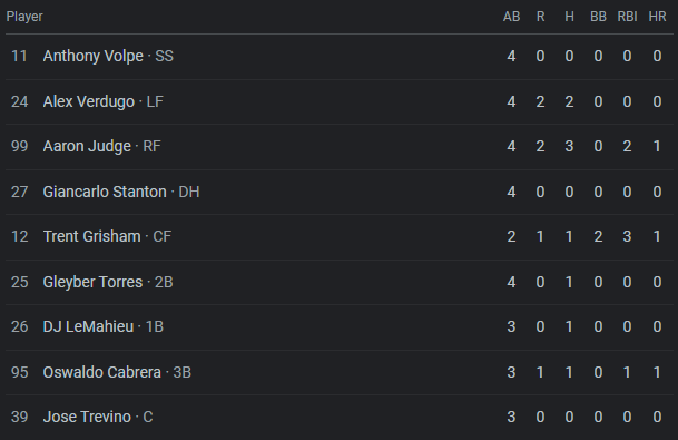 Tyler Glasnow struck out 12 Yankees but did give up five earned runs. He gave up two homers and eight hits. It’s not really something we have to talk about, Glasnow is very clearly a top three starter in the league. What is more interesting is the Yankees lineup without Juan Soto in it. I guess he’ll be back soon, but that’s a big loss for them when he’s not there. This is what it looked like last night: