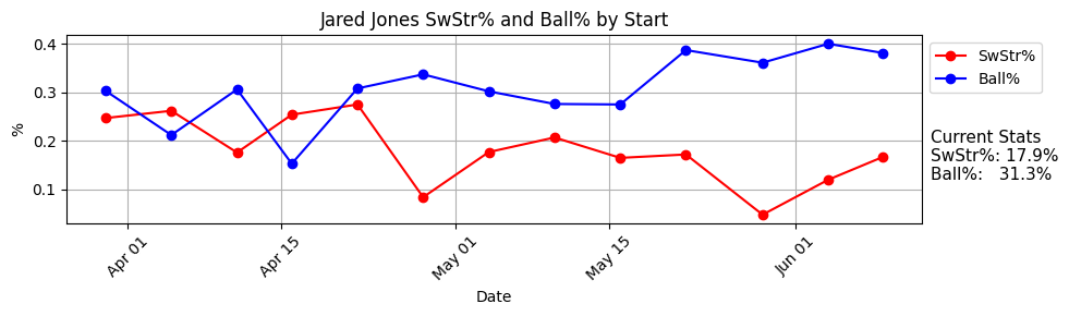 His season walk rate sits at 11.9%, but it’s 8.6% in his last 8 starts, he had a 17.6% BB% in April which has kept the season number inflated.