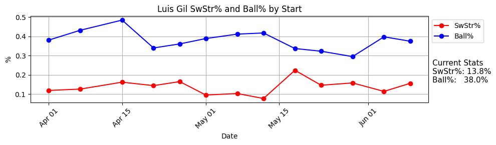 That’s a very strong SwStr% and it could have gone a lot better for him as the first inning was just a mess and there was a really bad ump call that cost him a run, but it’s hard to say his command hasn’t seriously regressed since that first month.