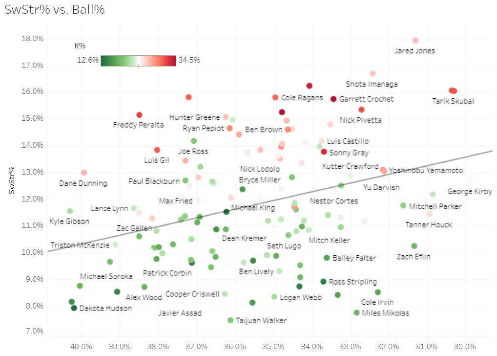 What we’re really looking for here are low ball rates with strong swinging-strike rates. So we can look at this plot: