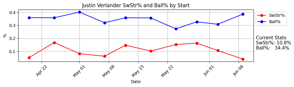 Justin Verlander struggled a bit, allowing seven hits and four runs in five innings. The season SwStr% is now just 10.8% and the K% is 21%.