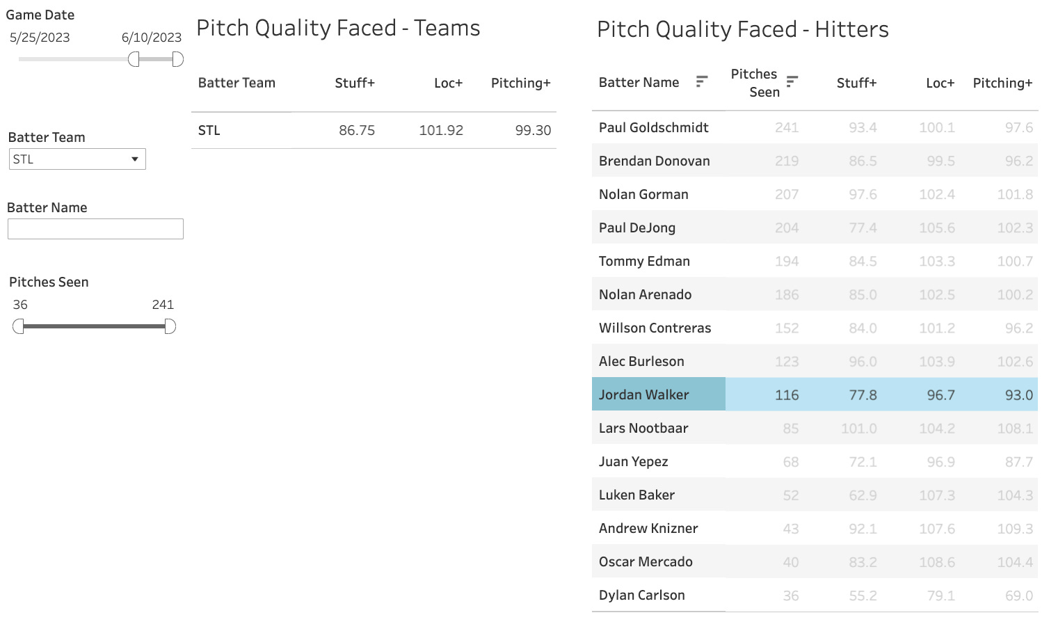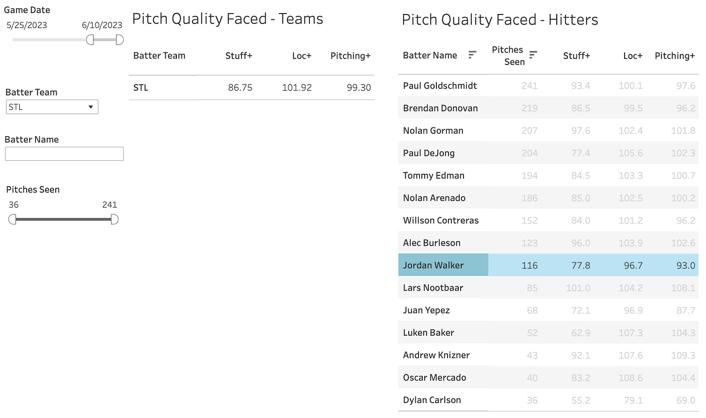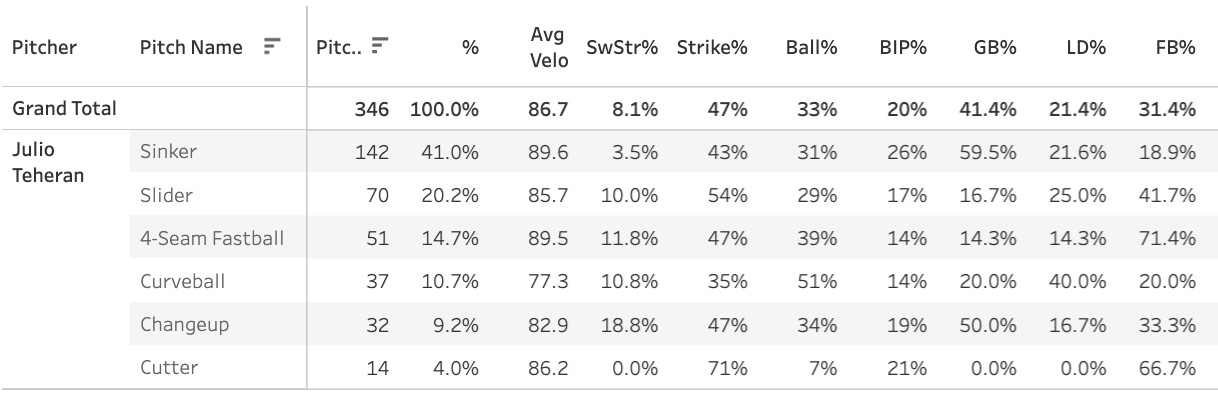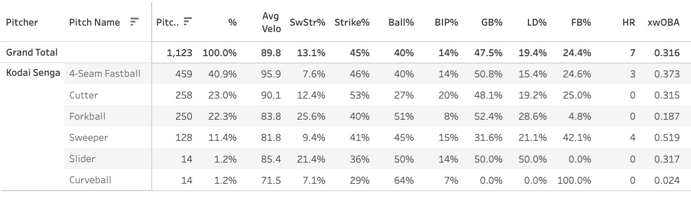 The pitch mix is an embarrassment of riches. Above-average Stuff+ on all five pitches, great strike rates on both fastballs and the slider, and an absolutely sick 21.3% SwStr% on the slider.