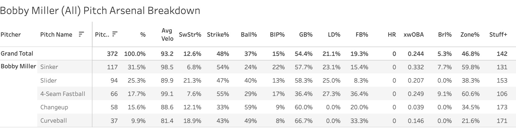 15. Bobby Miller (LAD): 46.2 Strike%, 41.3 Ball%