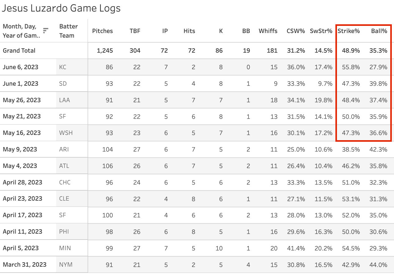 14. Taj Bradley (TB): 46.7 Strike%, 38.7 Ball%