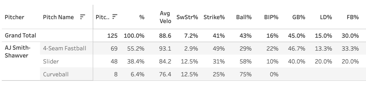 Pretty bad marks, but it’s just 125 pitches thrown so let’s take it easy. The Stuff+ in the very early sample on the fastball is 60 and the slider has a mark of 52. Can’t really trust those numbers after less than 100 pitches thrown, but it’s not a great sign!