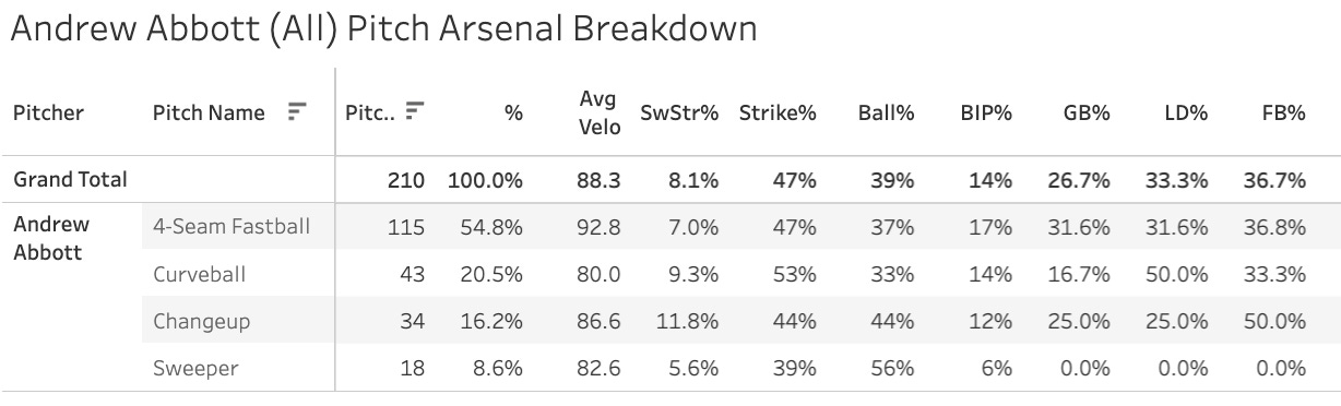 As predicted last week, Andrew Abbott brought the four-seam usage down in his second start. He threw more changeups this time around. Another good box score result with 5.2 scoreless, but he walked three and only struck out four.