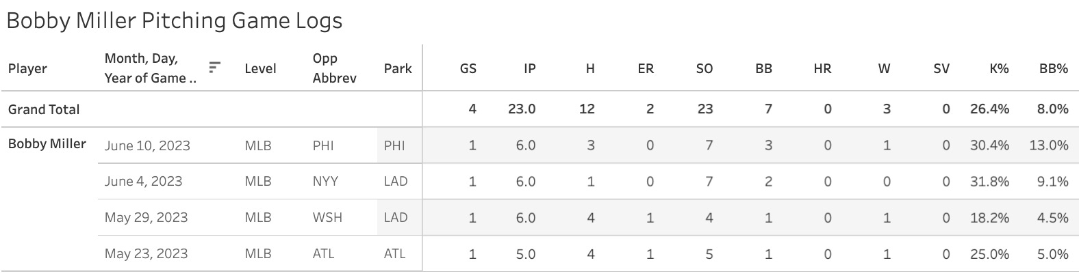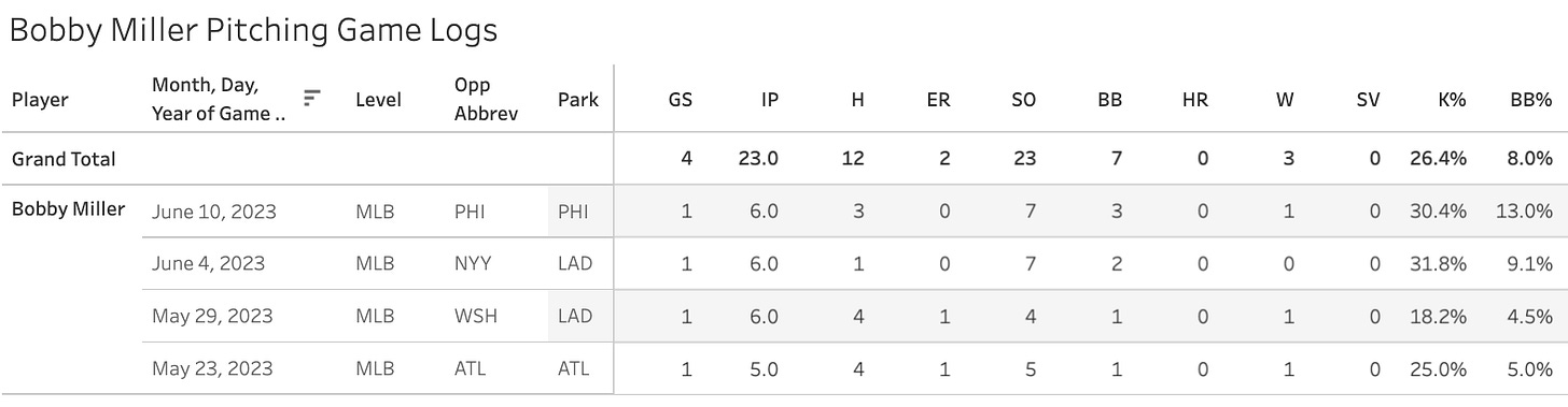 Bobby Miller did it again, and I think he’s pretty clearly the best rookie SP going right now. A 14.4% SwStr% yesterday over six scoreless innings.