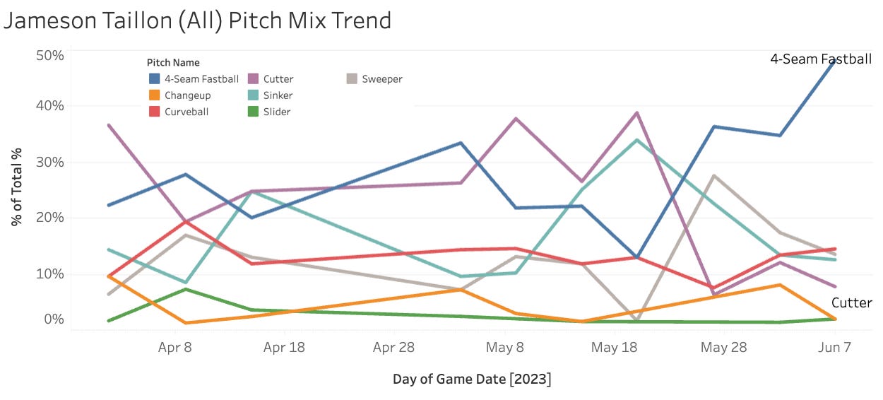 It’s a Brayan Bello night tonight, and my fantasy team will be needing a good outing from him on Sunday Night Baseball! We see below what I’ve been talking about recently as he’s weirdly bailed on his sinker, which I think is his most effective pitch. Let’s see if it comes back tonight, I hope it does - but I’m also not going to sit here and talk like I know better than Bello and the Red Sox coaching staff, because I certainly don’t.