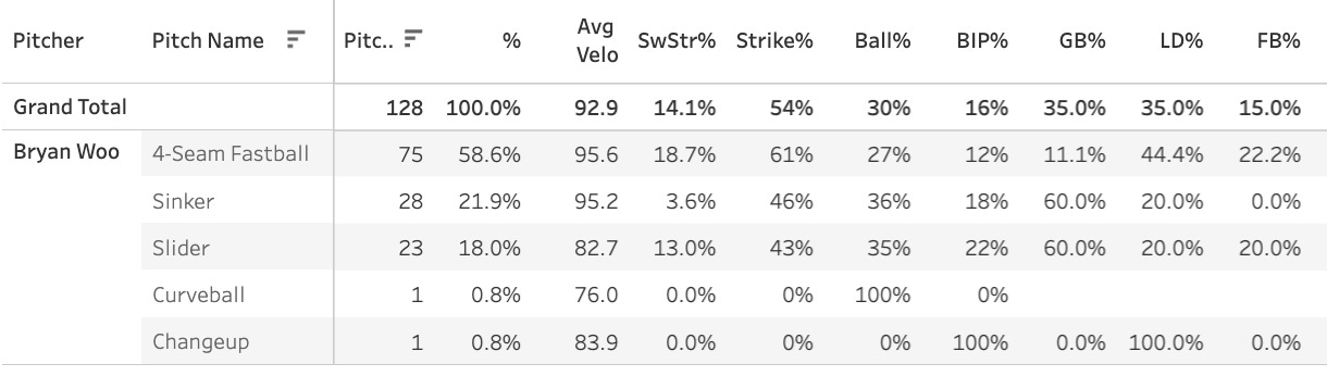 2. Bryan Woo (SEA): 55.6 Strike%, 30.9 Ball%