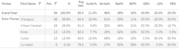 Drew Thorpe’s debut went well in the box score but not so much in the advanced numbers: