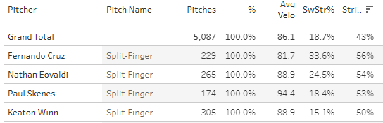 It’s not a typical splitter so it’s not really one to compare to other splitters, but let’s do it anyway. His 53% Strike% on the splitter is third-best in the league for splitters thrown at least 150 times.