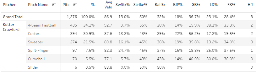 Kutter Crawford shook off his recent bad stretch with a quality start (6 IP, 6 H, 2 ER, 8 K, 1 BB). He did give up two unearned runs so it wasn’t the greatest performance in the real world. His season K% is at 23.4% with a 13% SwStr% and a 7.4% BB%. So he’s fine, but I don’t think he’s like a must-start guy in a 10-team league or something like that. Last year he really impressed me with a high SwStr% on his four-seamer, but that hasn’t been the case this year at 9.7%. The Strike% on it is elite at 55%, so it’s still working nicely.