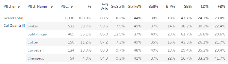 10. Cal Quantrill (COL): 46.0 Strike%, 39.0 Ball%