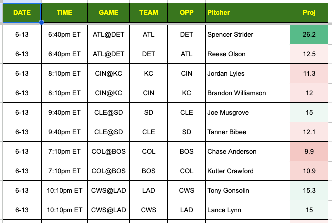 It goes on for the next 10 days, so you can use that to see your upcoming SP matchups or find a streamer or something. The “Proj” column is actually just an average of the last three projections I’ve made for each pitcher, it’s not an actual projection using the opponent and ballpark and stuff - but I thought it was a useful thing to add to see generally what the projection model thinks about those guys.