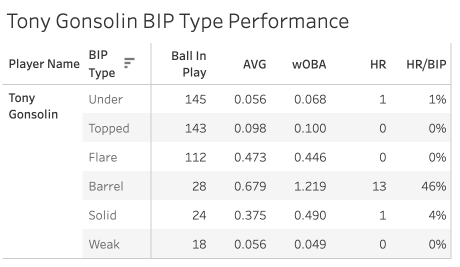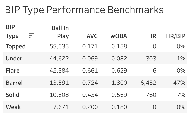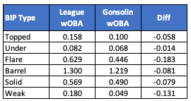 He is having an inordinate amount of success on balls in play. To really investigate this, we can use Statcast’s launch_speed_angle classification model. I gave a full explanation of these ball in play types here, so give that a read if your heart tells you to.