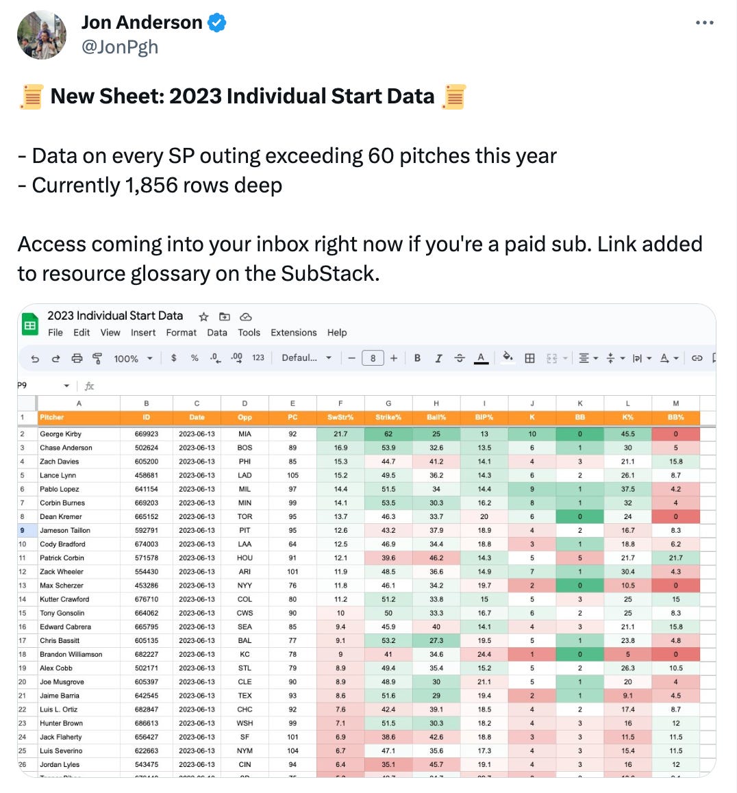 The downside is that K% is down way below what I expected from him. He’s at 22% right now on a below-average 11.7% SwStr%. I’d be interested to explore how high you can feasibly take a K% when you’re throwing as many strikes as Kirby is. Pitches in the zone are obviously going to be easy to hit than pitches out of the zone, and Kirby is filling up the zone. But he should not change anything, because he’s still controlling contact well with a 46% GB% and a good 40.4 PA/HR, he’s a great pitcher and one of the most interesting statistical guys in the league.